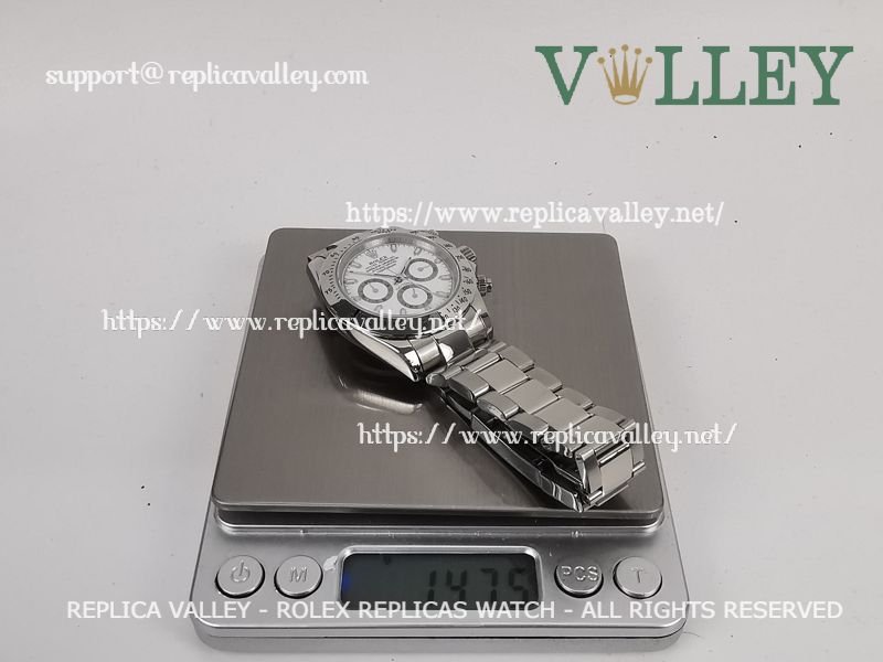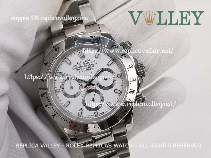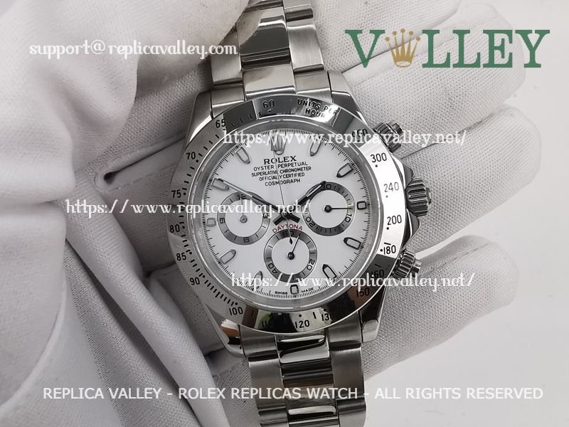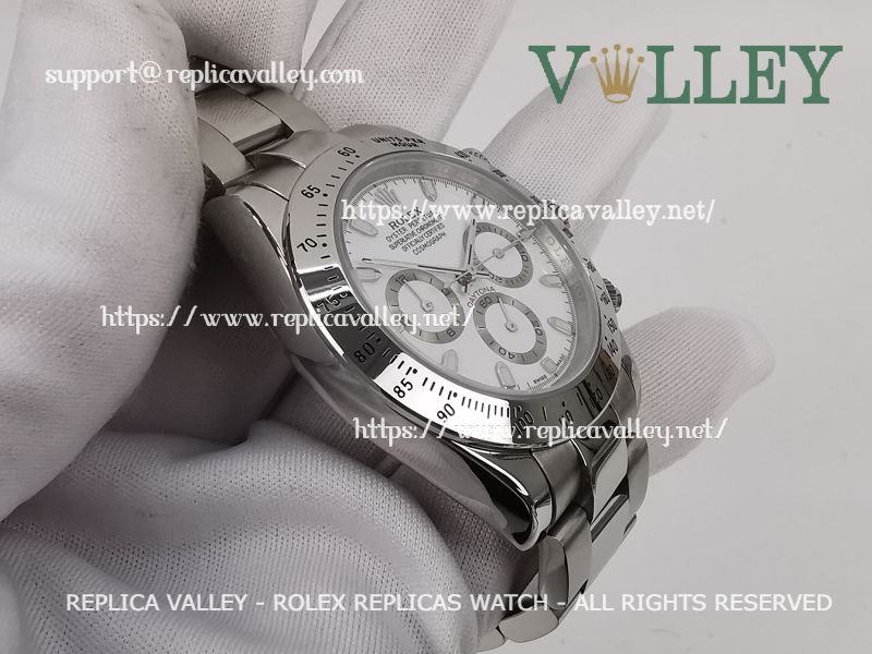 Model: SS Case/Tachymeter Bezel, White Dial with stick markers, Silver ring Subdials, Luminous Index/Hour Markers, Engraved ROLEXROLEX on rehaut