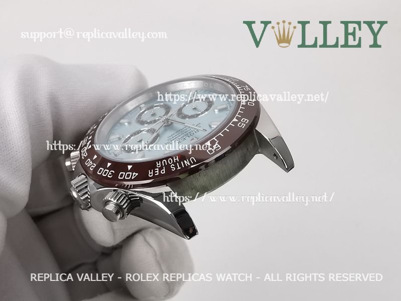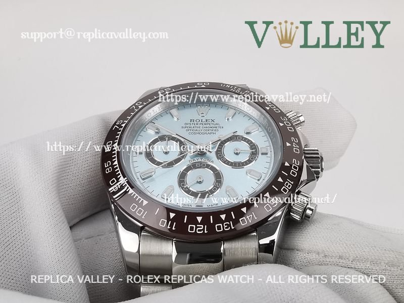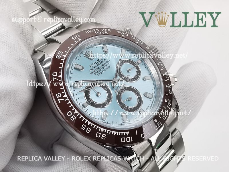 Model: SS Case, Ceramic Tachymeter Bezel, Ice Blue Dial with Stick markers, Chestnut ring Subdials, Engraved ROLEXROLEX on rehaut