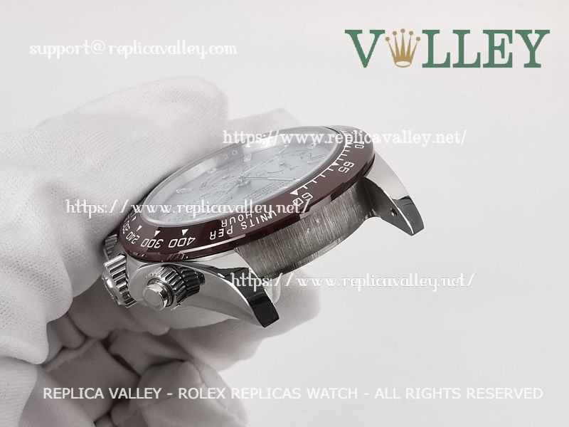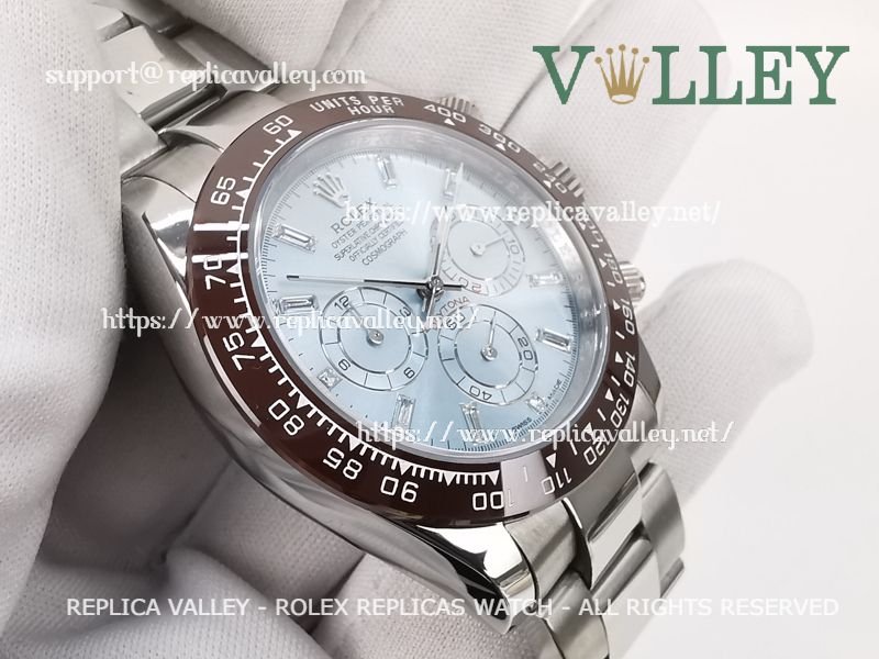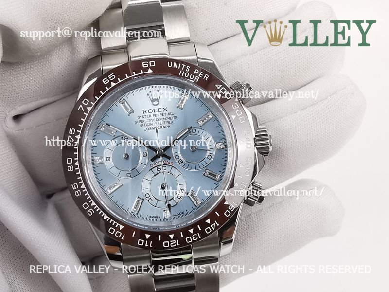 Model: SS Case, Ceramic Tachymeter Bezel, Ice Blue Dial with Baguette Diamond markers, Silver ring Subdials, Engraved ROLEXROLEX on rehaut