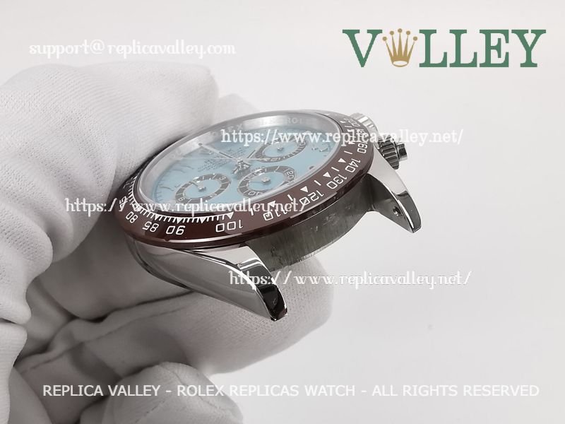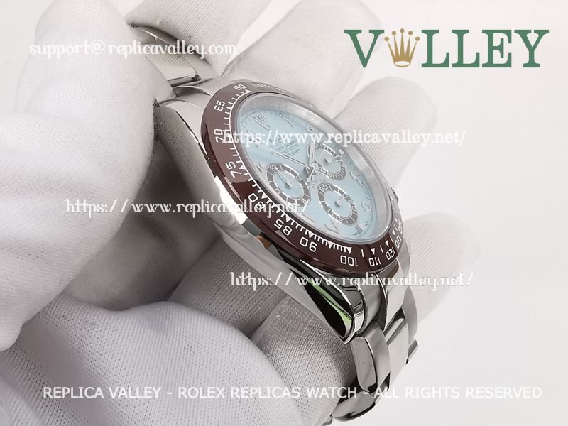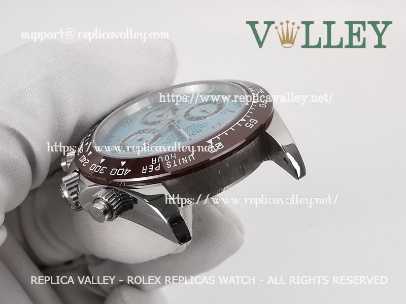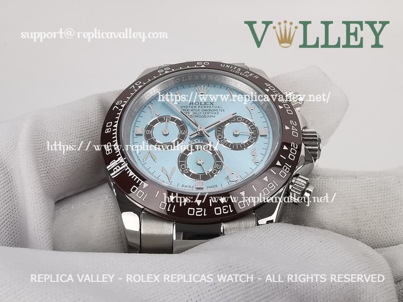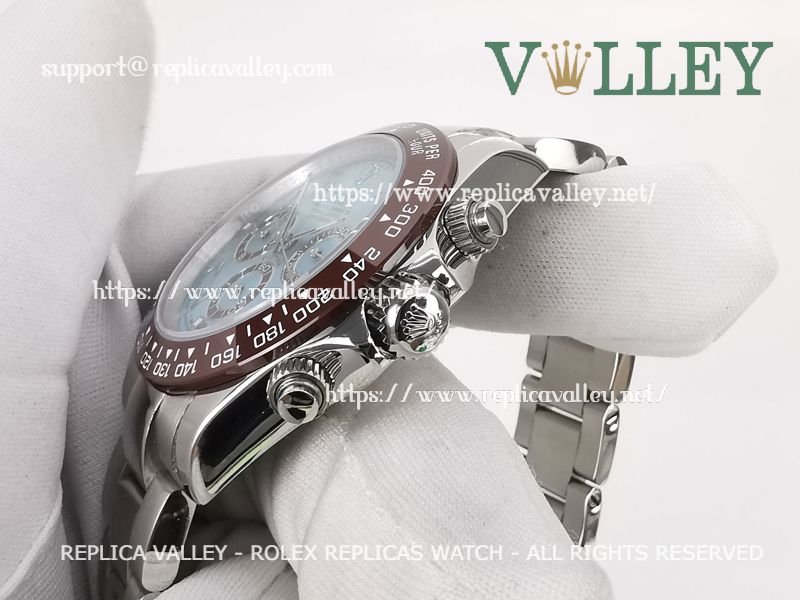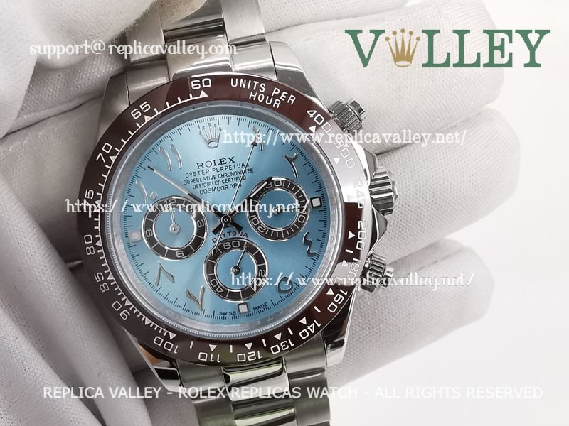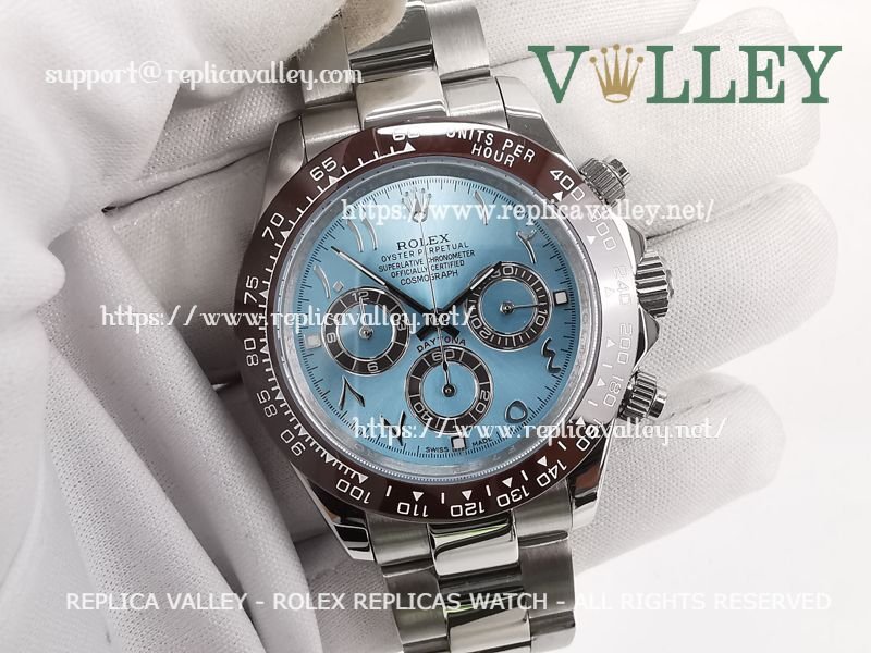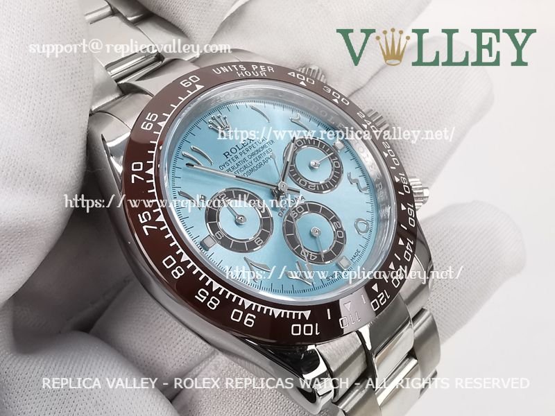 Model: SS Case, Ceramic Tachymeter Bezel, Ice Blue Dial with Arabic-oriental, Chestnut ring Subdials, Engraved ROLEXROLEX on rehaut