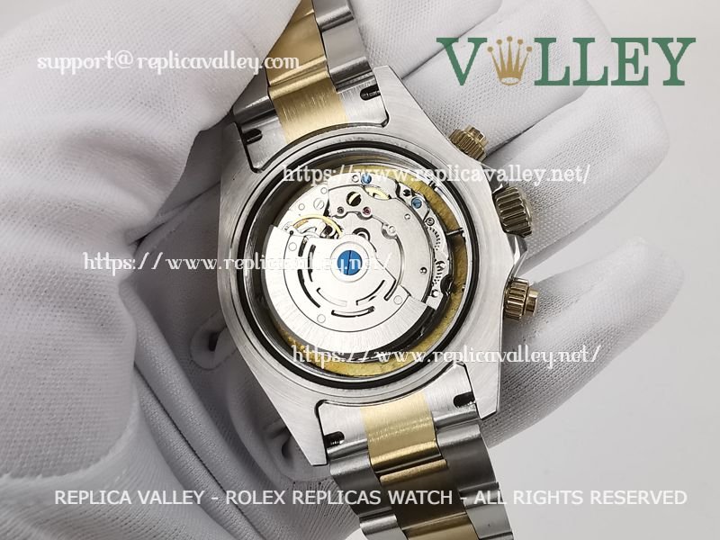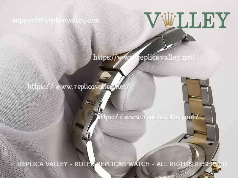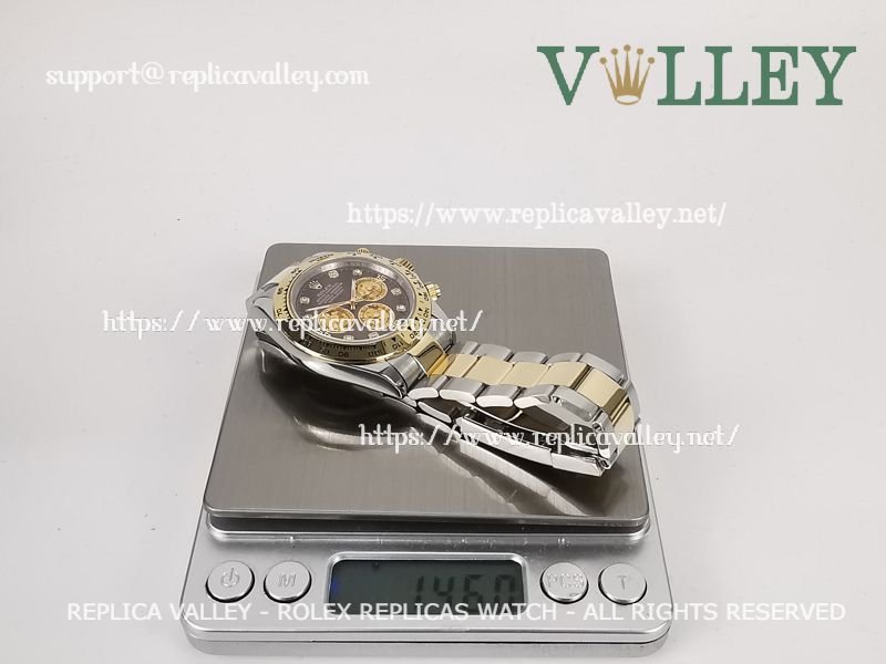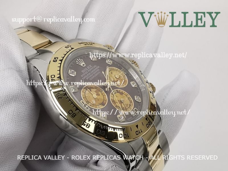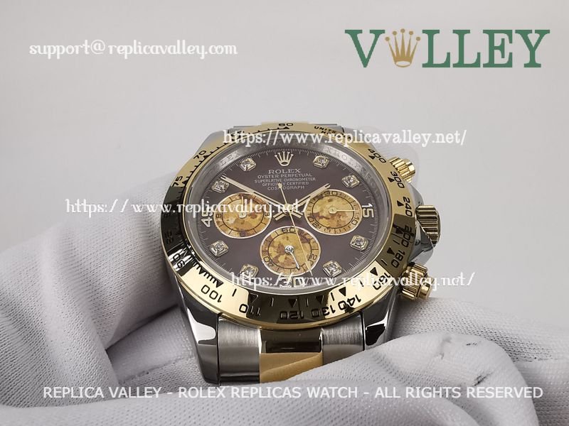 Model: SS Case, Yellow Gold Plated Tachymeter Bezel, Black Mother of Pearl Dial with Diamond markers, Engraved ROLEXROLEX on rehaut