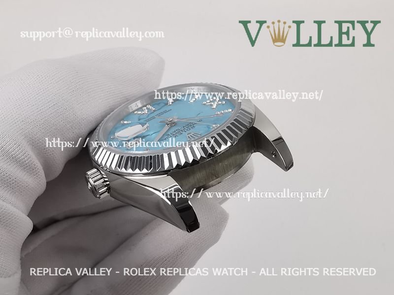 Model: SS Case, Fluted Bezel, Turquoise Dial with Roman Diamond markers, Engraved ROLEXROLEX on rehaut