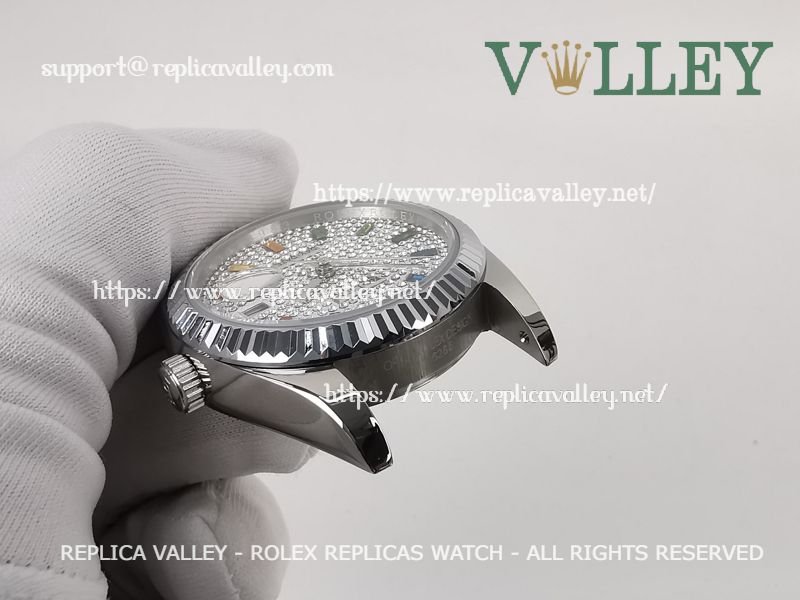 Model: SS Case, Fluted Bezel, Diamond-Paved Dial with Rainbow-Coloured Diamond markers, Engraved ROLEXROLEX on rehaut