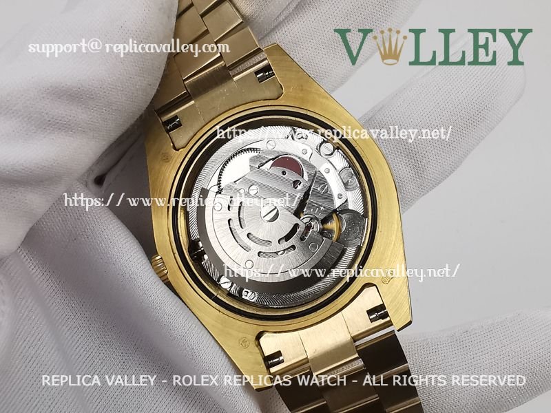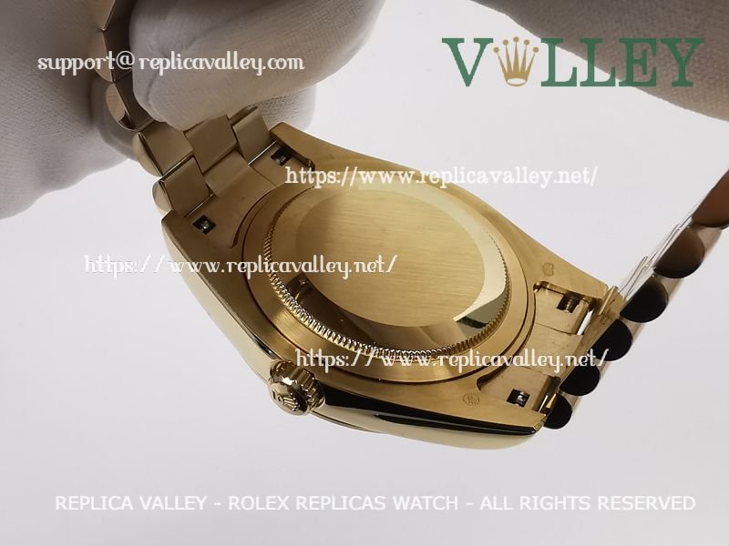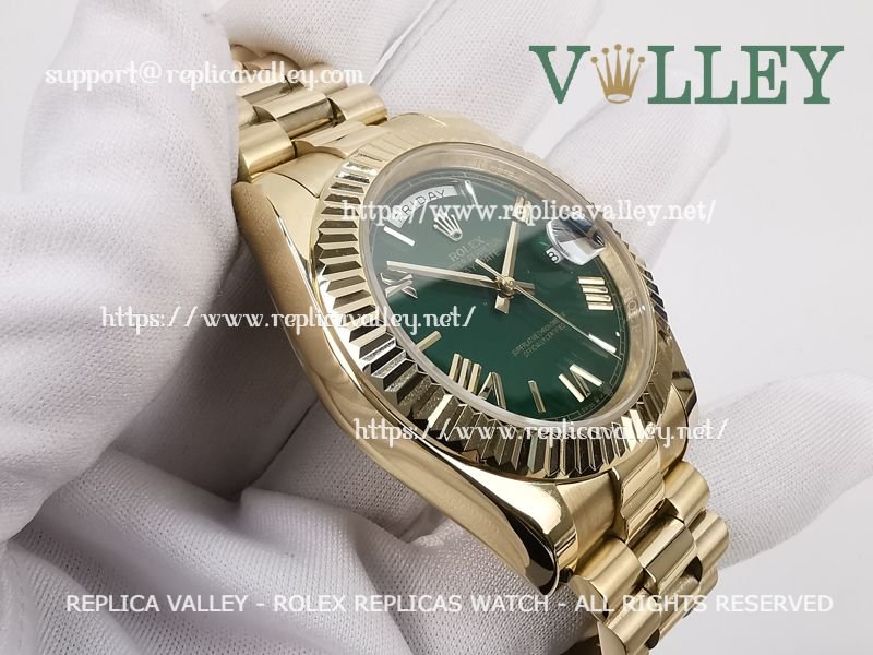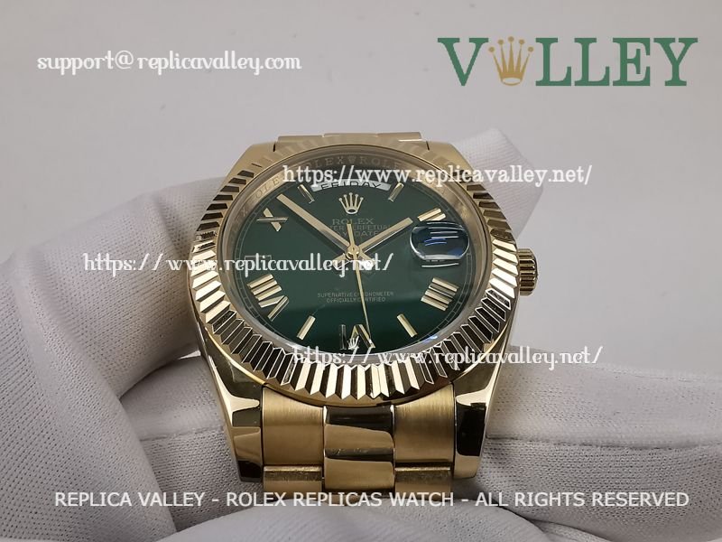 Model: Yellow Gold Plated SS Case, Fluted Bezel, Green Dial, Roman Markers, Engraved ROLEXROLEX on rehaut