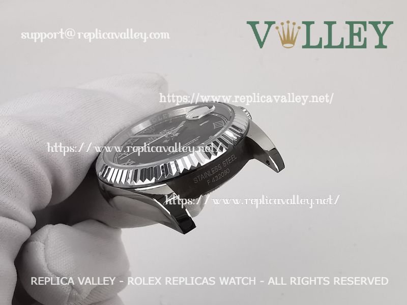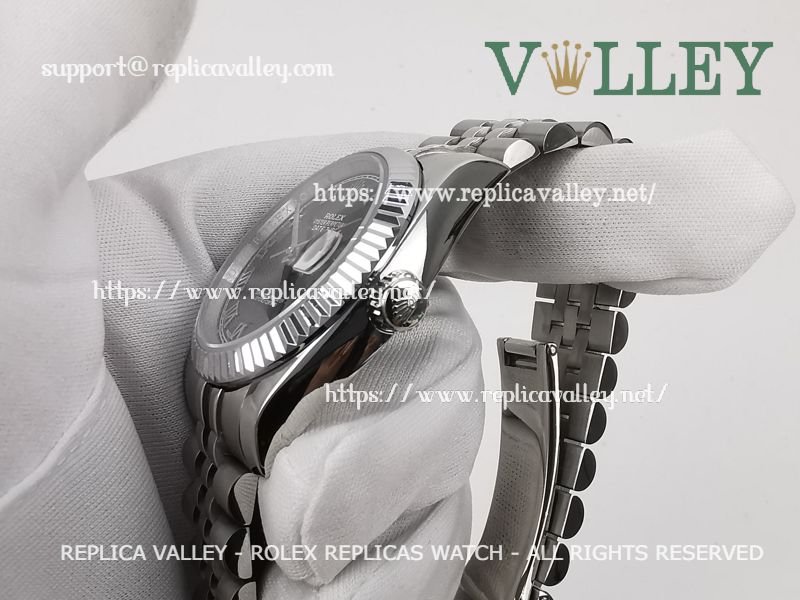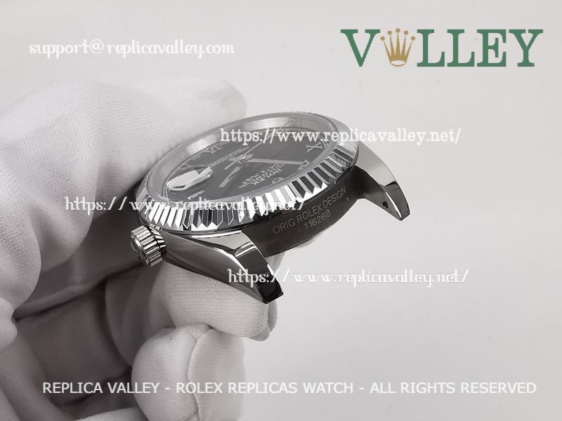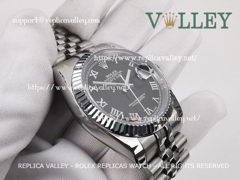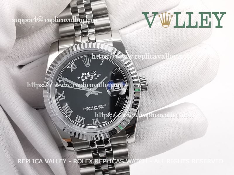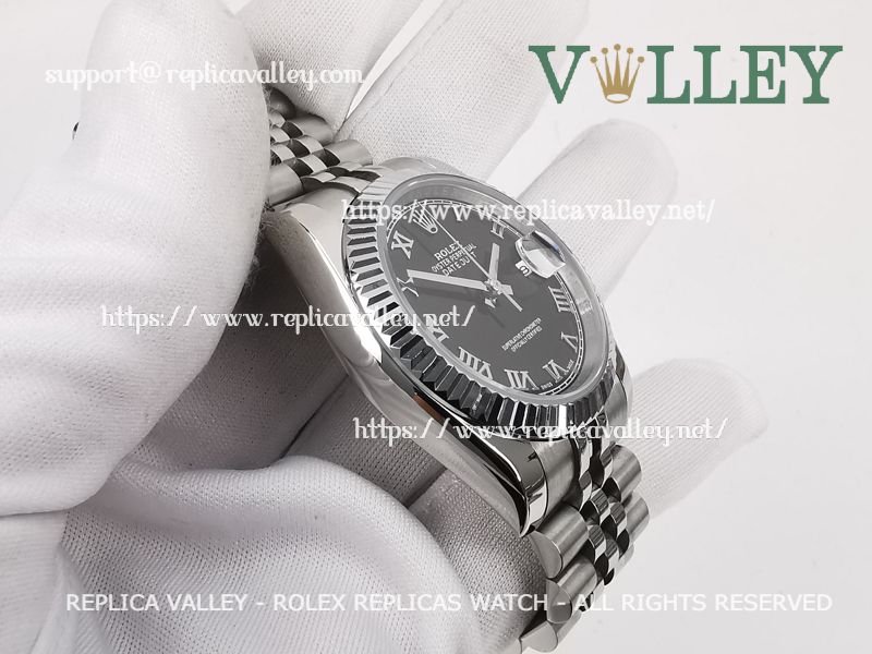 Model: SS Case, Fluted Bezel, Black Dial, Roman Markers, Engraved ROLEXROLEX on rehaut