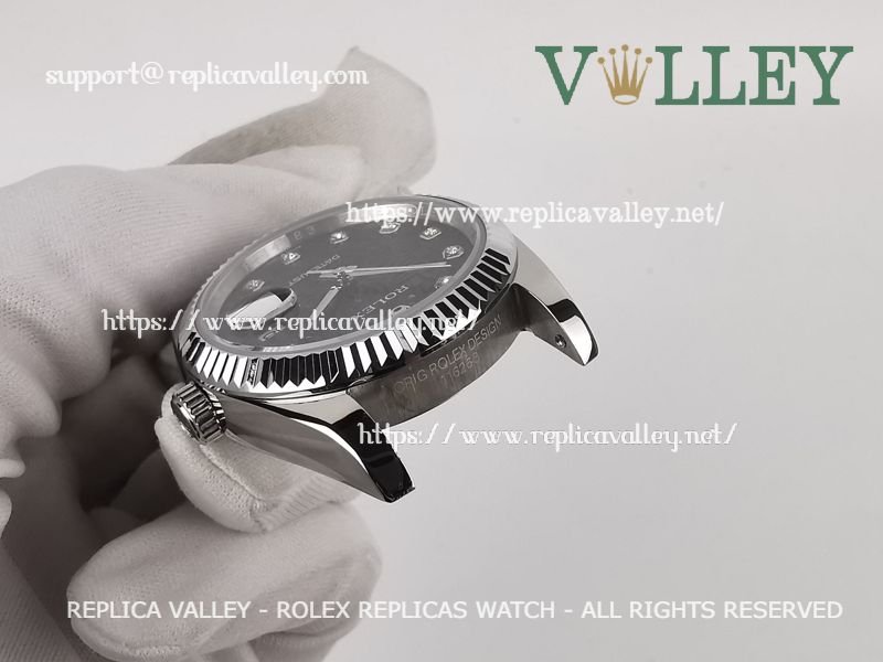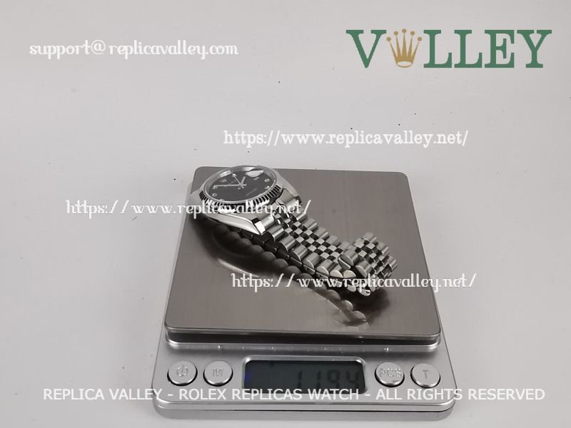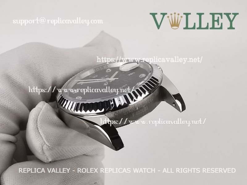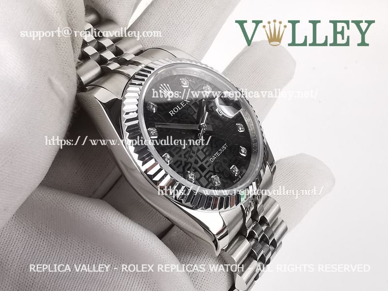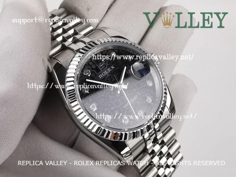 Model: SS Case, Fluted Bezel, Black Jubilee Dial, Diamond Markers, Engraved ROLEXROLEX on rehaut