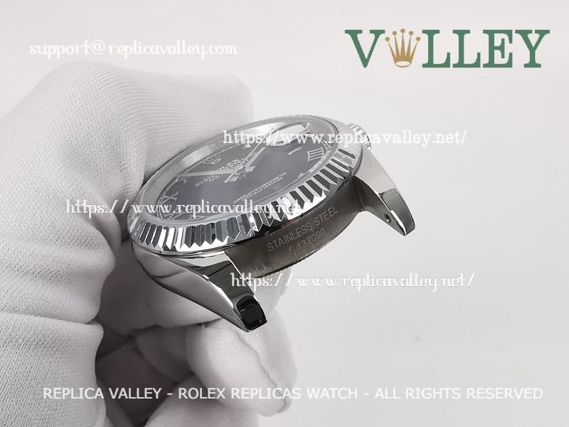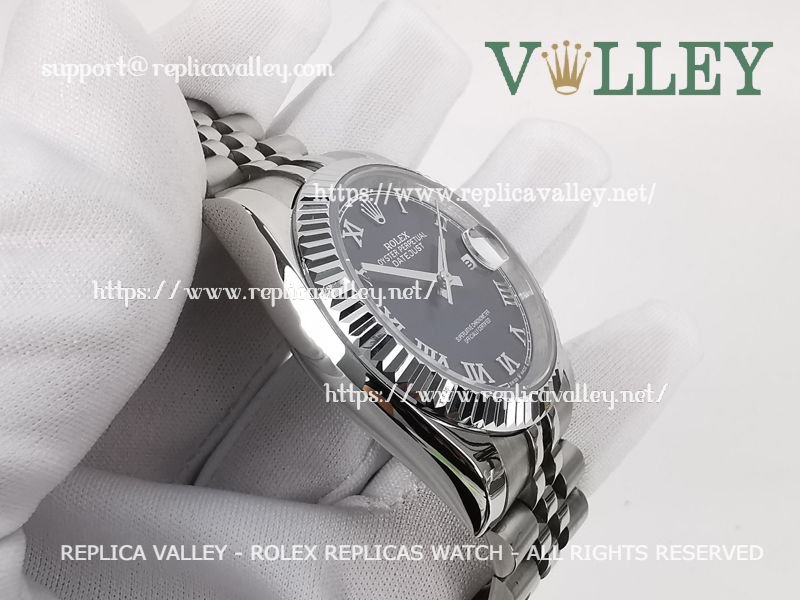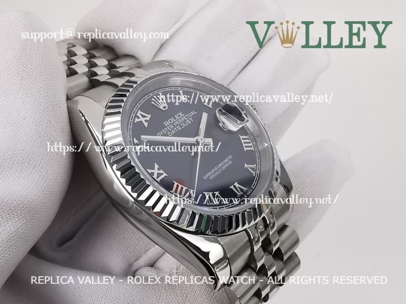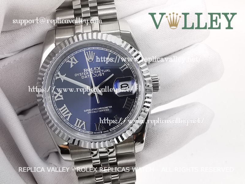 Model: SS Case, Fluted Bezel, Blue Dial, Roman Markers, Engraved ROLEXROLEX on rehaut