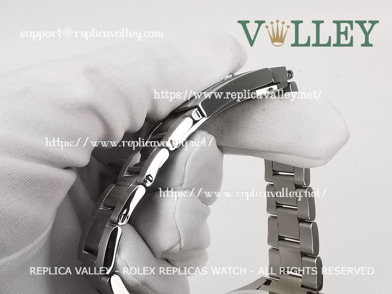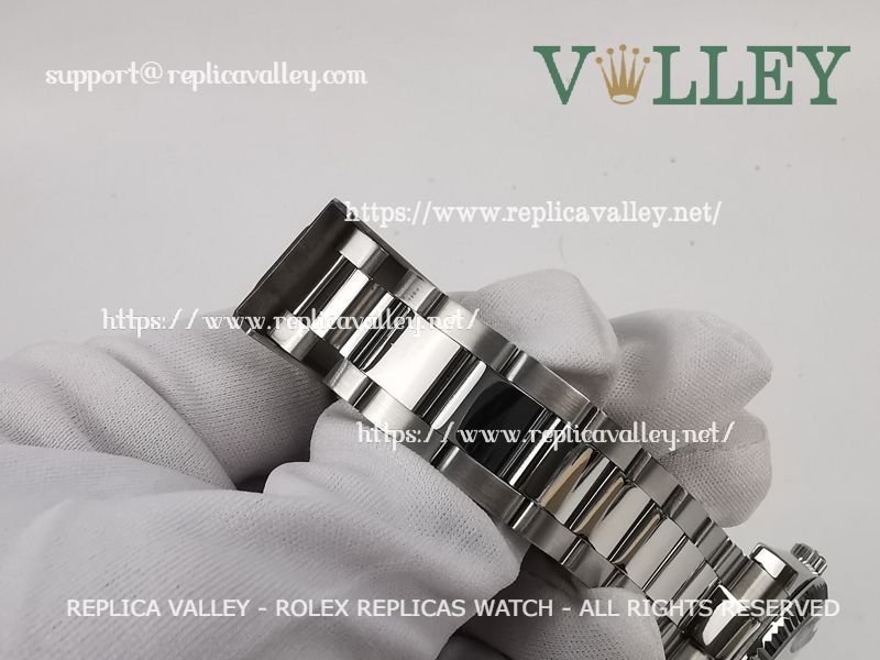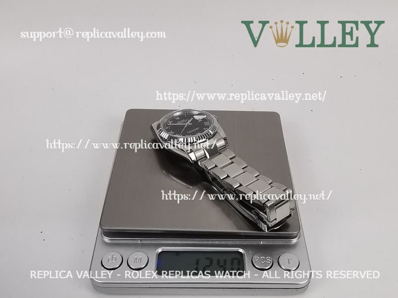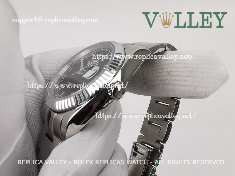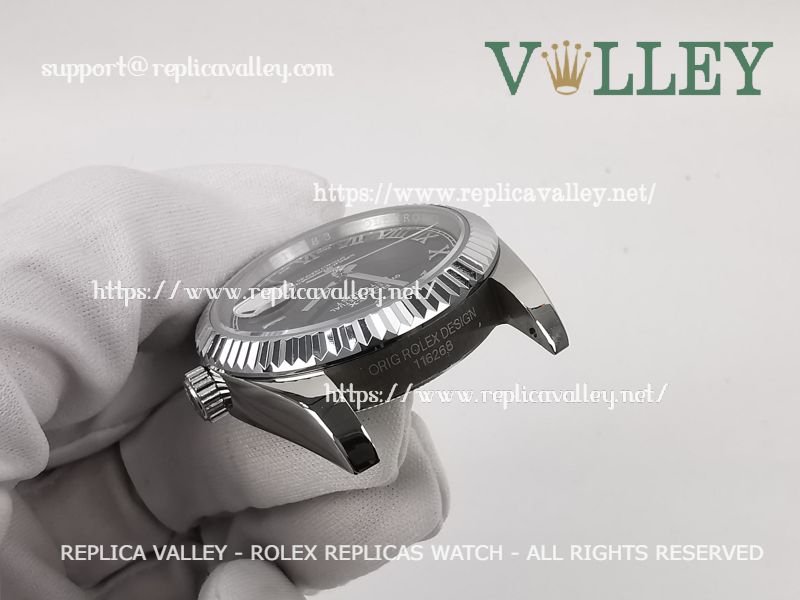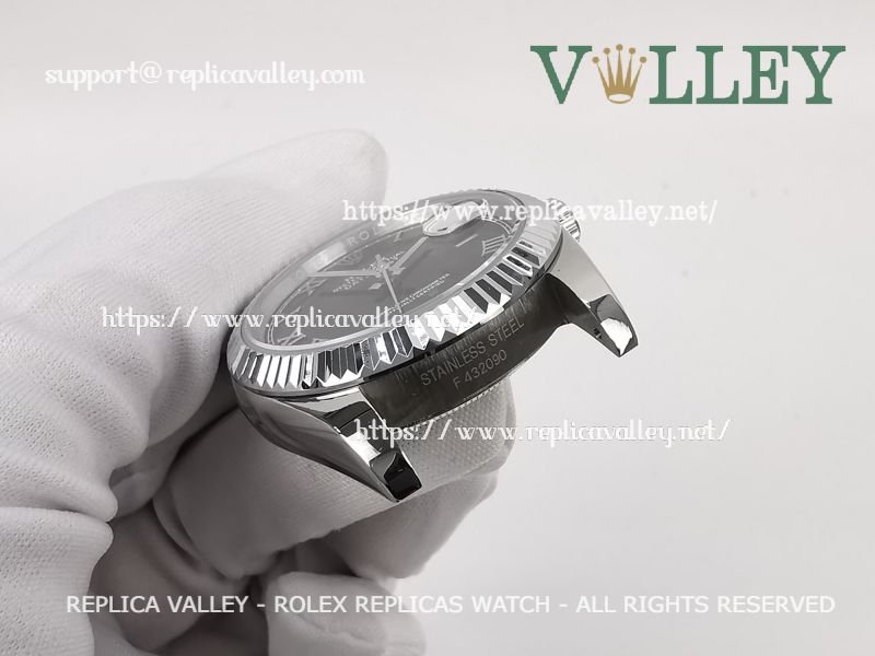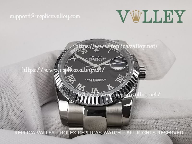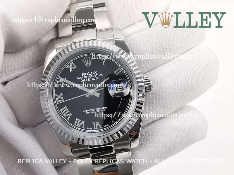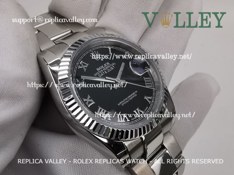 Model: SS Case, Fluted Bezel, Black Dial, Roman Markers, Engraved ROLEXROLEX on rehaut