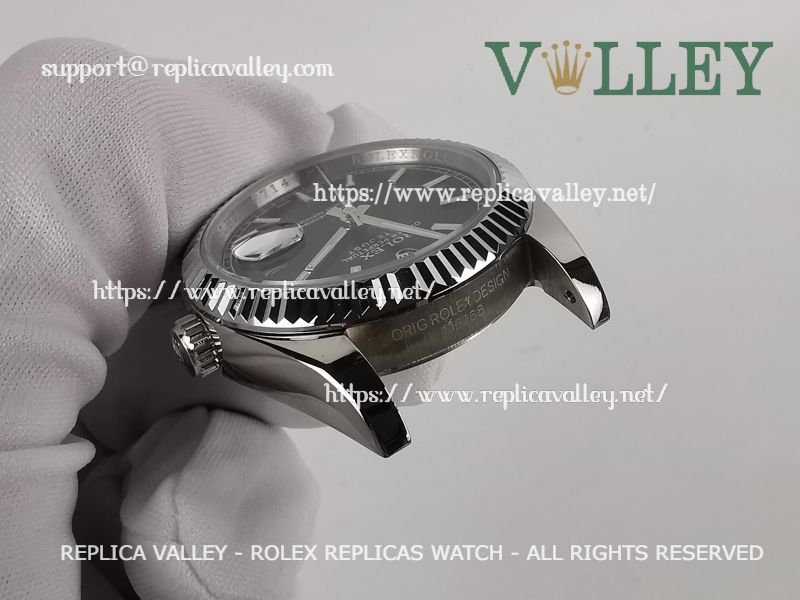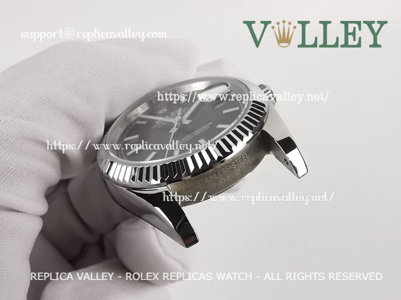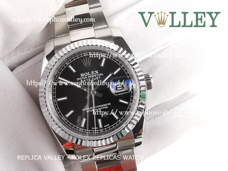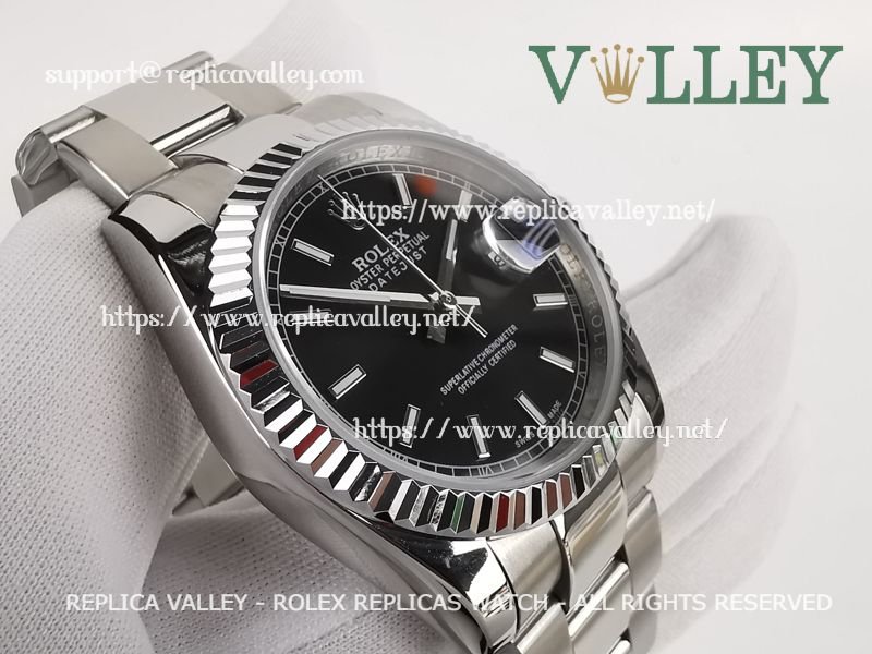 Model: SS Case, Fluted Bezel, Black Dial, Stick Markers, Engraved ROLEXROLEX on rehaut