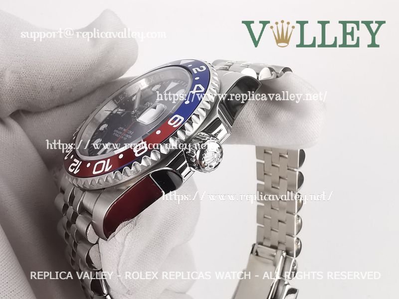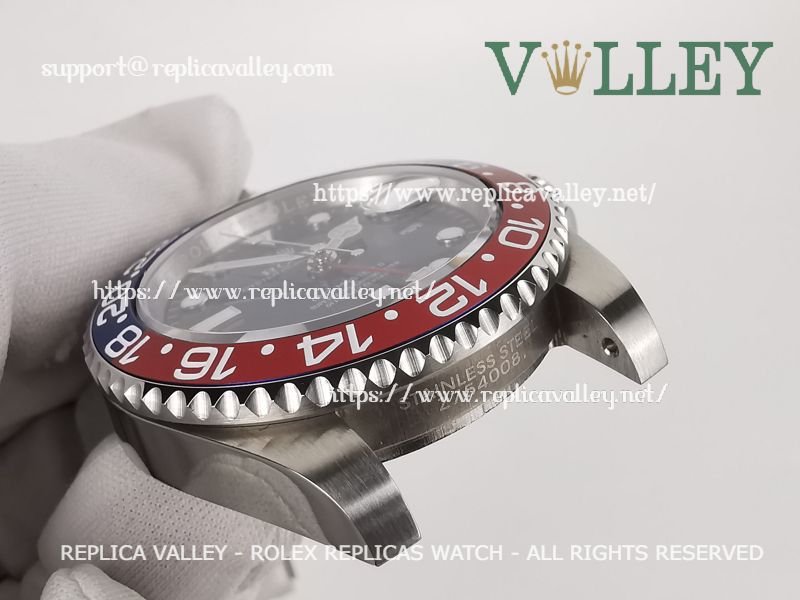 Model: 316L Stainless Steel in Polished Finish and Bezel, Red/Blue Pepsi Ceramic Insert (Bi Directional Rotating GMT Bezel), Luminous Dot Markers, Engraved ROLEXROLEX on rehaut