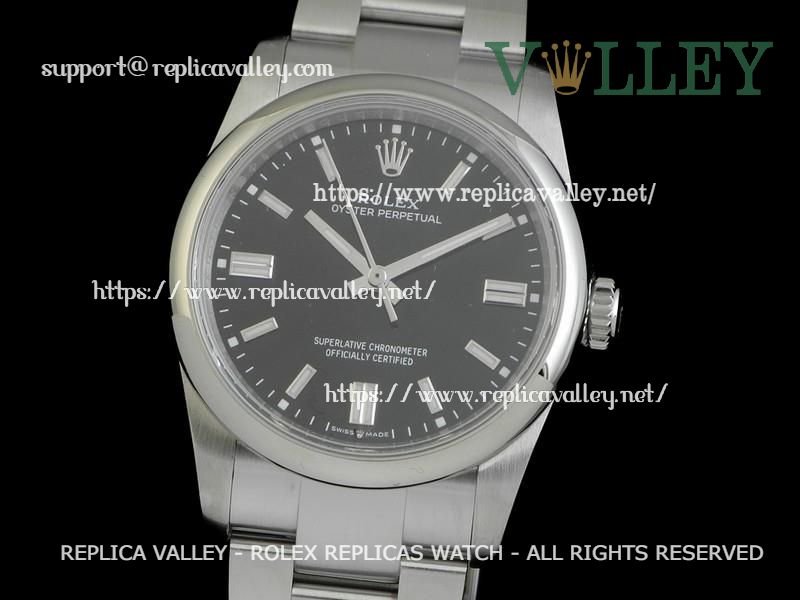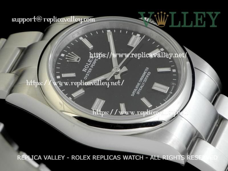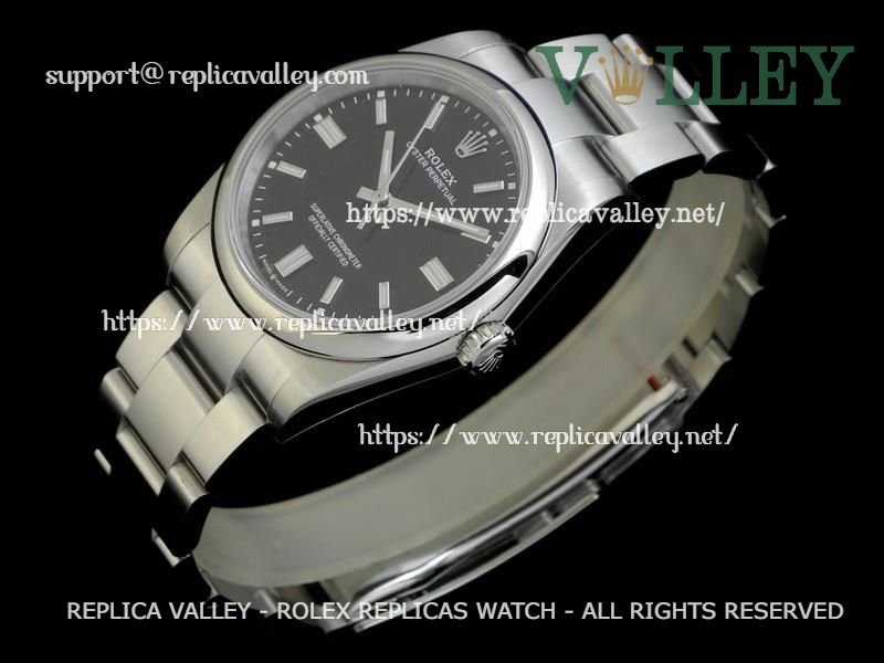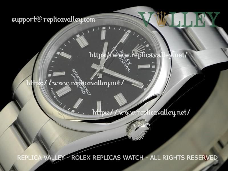 Model: SS Case, Domed Bezel, Bright Black Dial, Luminous Stick Markers, Engraved ROLEXROLEX on rehaut
