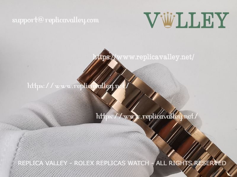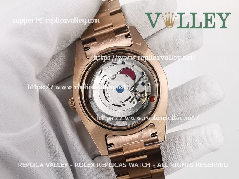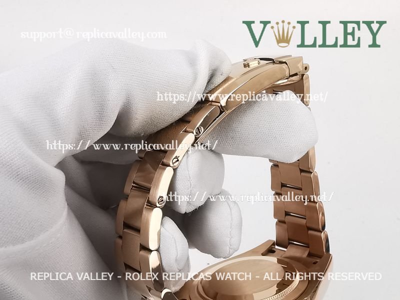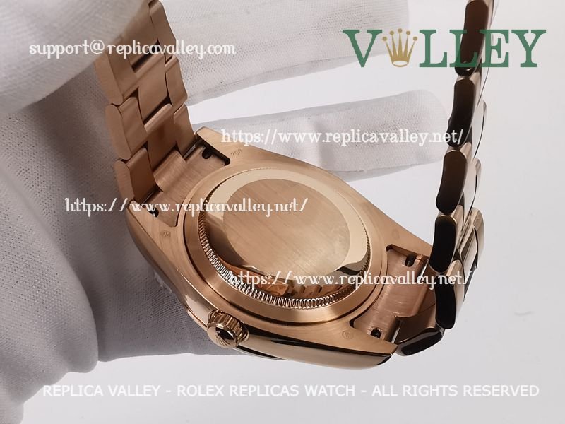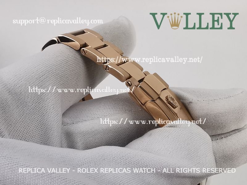 Model: Rose Gold Plated Stainless Steel Caseset, Fluted Bezel, Blue Dial, Stick Markers, Engraved ROLEXROLEX on rehaut