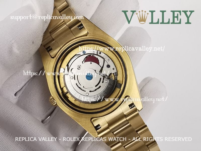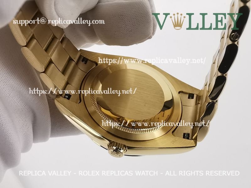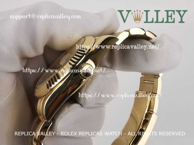 Model: Yellow Gold plated Stainless Steel Caseset, Fluted Bezel, Gold Dial, Stick Markers, Engraved ROLEXROLEX on rehaut